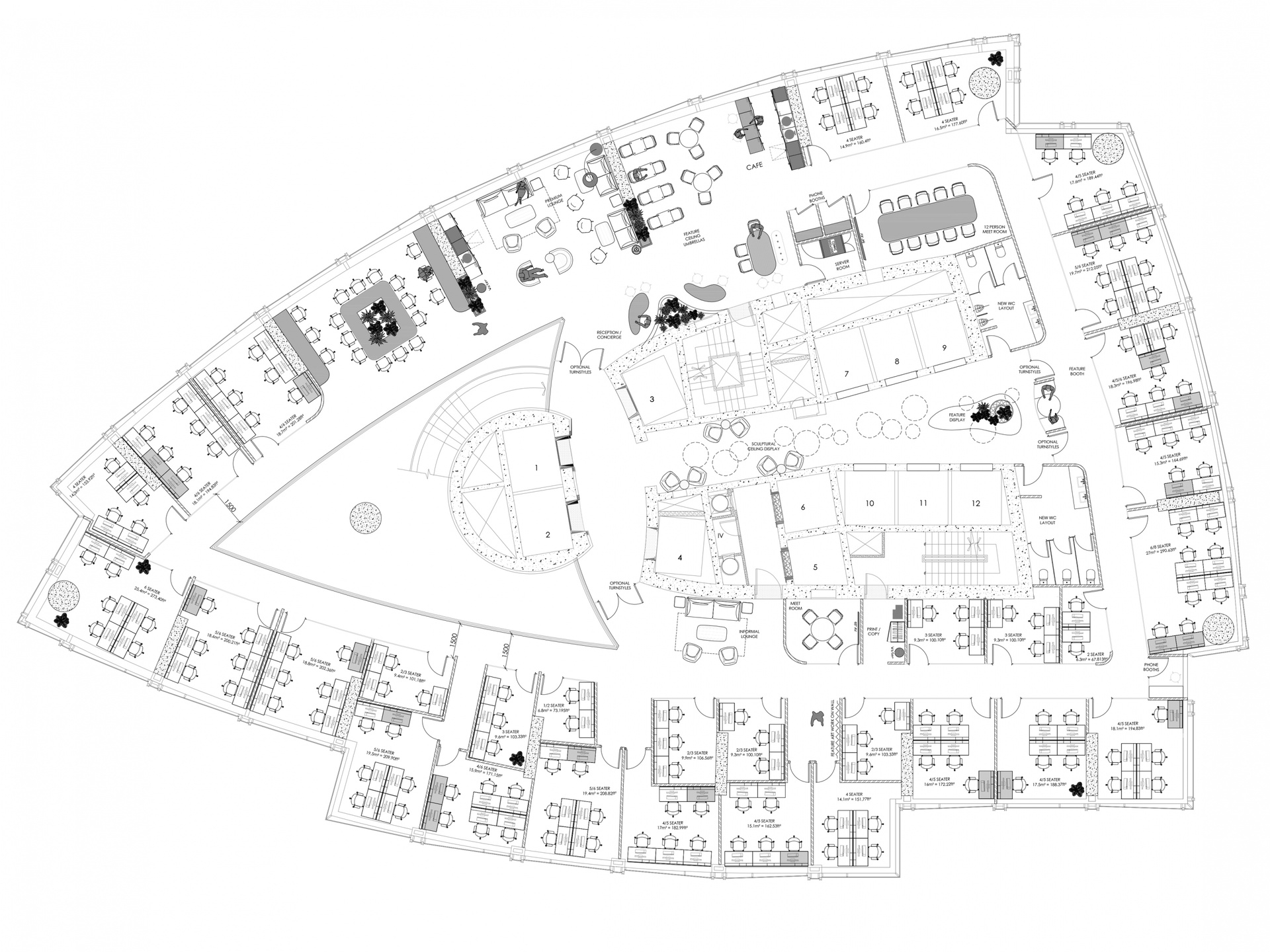 - Mixed Planning: Flexible workspace layouts – private offices, collaborative zones and meeting rooms designed for diverse operational needs.